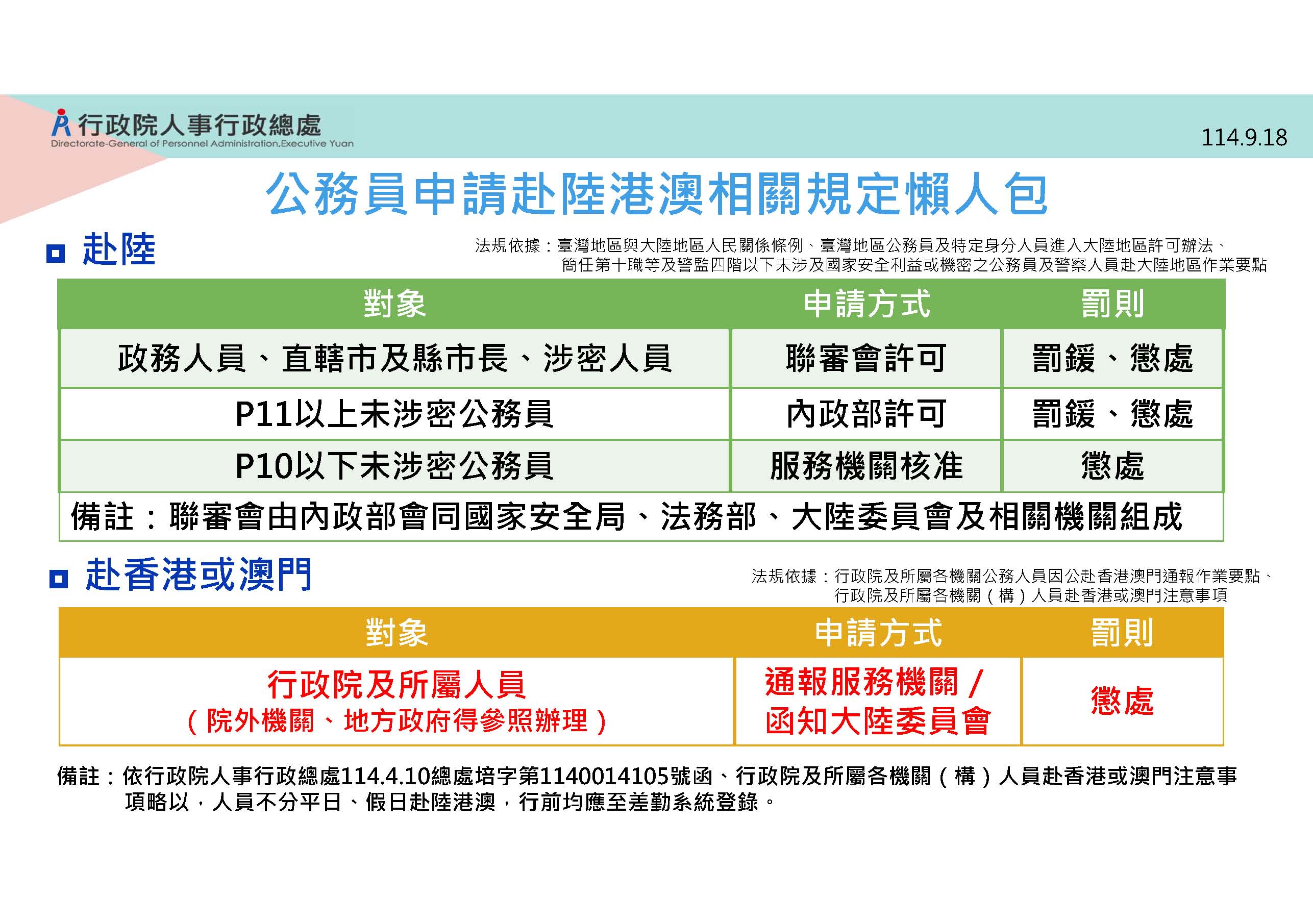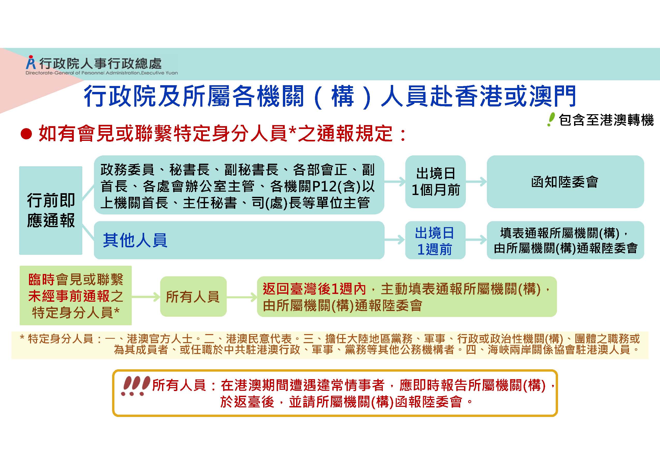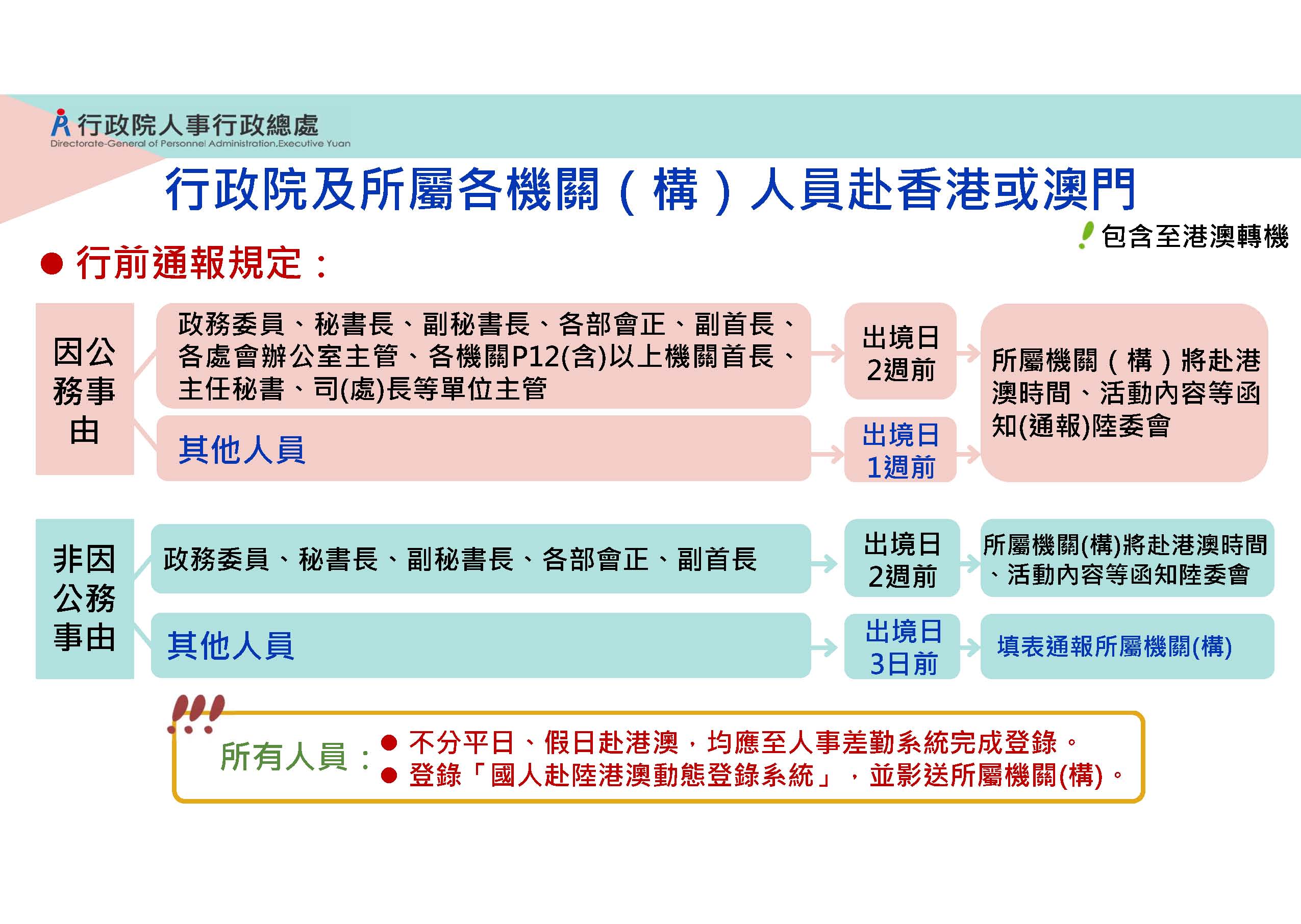 一、行政院業以114年9月10日函修正「行政院及所屬各機關(構)人員赴香港或澳門注意事項」第3點、第4點,修正重點如下: